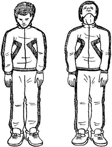 9. «Маятник головой». И. п. то же. Сначала нужно опустить голову вниз, посмотреть в пол и сделать вдох. Затем, не прекращая движения, поднять голову вверх, посмотреть в потолок и тоже сделать вдох. Выдох происходит во время движения головы.