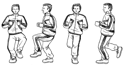 11. «Передний шаг». И. п. то же. Ноги поставить чуть уже ширины плеч. Сначала нужно поднять согнутую в колене левую ногу до уровня живота (нога от колена прямая) и присесть на правой, сделав вдох. Вернуться на 1 с в исходное положение. Затем надлежит поднять вверх согнутую в колене правую ногу и присесть на левой, сделав вдох.