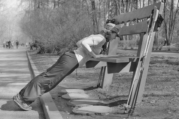 Это упражнение может быть выполнено в более сложном и более упрощенном варианте. Сядьте на скамью, поставьте ладони по обе стороны от корпуса на край скамьи и переместите бедра вперед. Ноги согнуты в коленях почти под прямым углом. При сгибании рук в локтях внимательно следите за тем, чтобы они шли строго вдоль корпуса назад, а не в стороны. В качестве усложнения вытяните ногу, как бы упираясь пяткой в стену (рис. 3.4). Поочередно сделайте по 2–3 отжимания на каждой ноге.