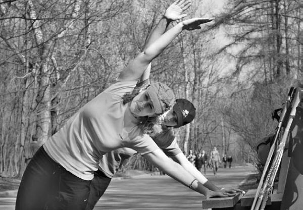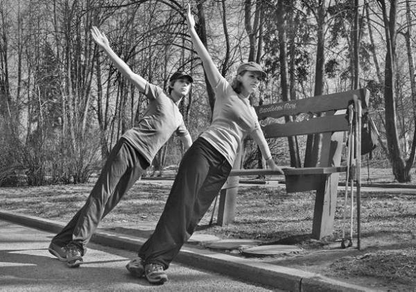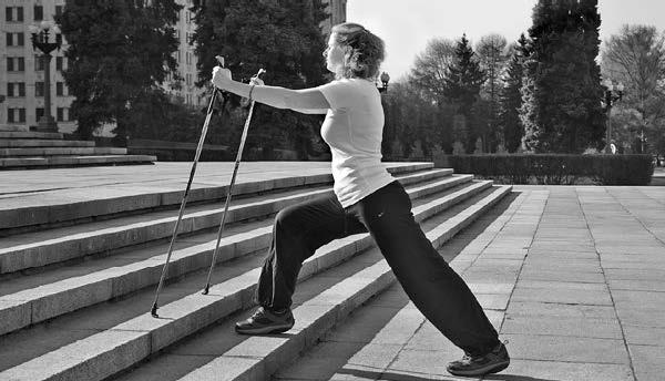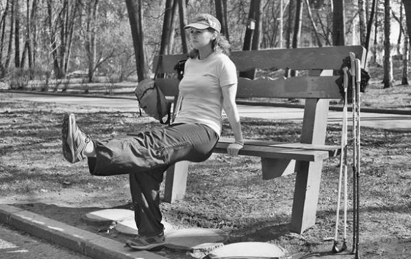 Советую ходить вверх по лестницам женщинам, стремящимся подтянуть мышцы задней поверхности ног и ягодиц. Кроме того, такие «восхождения» с палками – отличная тренировка сердца перед горными путешествиями. Палки облегчают работу ног, но за счет активных рук частота сердечных сокращений может резко увеличиться, следите за своим состоянием, используя пульсометр. После ходьбы по лестницам можно выполнить комплекс упражнений для ног.