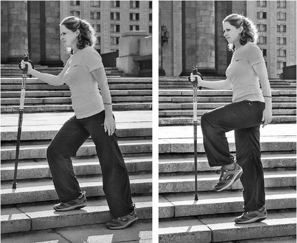 Встаньте ногами на разные ступени боком, опираясь на палку. Отрывайте ногу, стоящую на нижней ступени, от поверхности, сгибайте ее в колене и подтягивайте вверх как можно выше (рис. 3.6). На начальном этапе достаточно подтянуть ногу, чтобы бедро было параллельно поверхности земли. Сделайте несколько повторений и поменяйте ногу. В качестве усложнения можно увеличивать темп и число повторений.