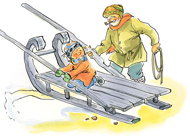 – Ну-ка посмотрим, – продолжал Ларс. – Надо вытащить вас поближе к свету. Эта оглобля вообще сломана. Я мог бы её починить, но, если запрячь в вас Гнедого, а он, по своему обыкновению, шарахнется в сторону, она сломается опять. Нет, надо перетащить вас в дровяник! Давай, Мортен, помоги мне столкнуть их с места, зато прокатишься на них от сарая до дровяника, а я в них запрягусь. И старые сани проедутся по снегу в последний раз, хотя и без лошади.