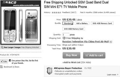 Как вам такое предложение «Free Shipping Mini E71 Mobile Phone TV Dual SIM Polish/Russian Hot Sell» всего за $20.48 США? Это телефон с двумя сим-картами, телевидением, поддержкой русского и бесплатной доставкой. Неплохо, да? Предприимчивые граждане скупают такой телефон десятками!