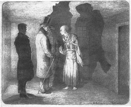 Свидание Льва Жемчужникова и Александра Бейдемана с Павлом Федотовым в частной лечебнице. П. Марков. Гравюра с рисунка по сепии А. Бейдемана.