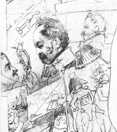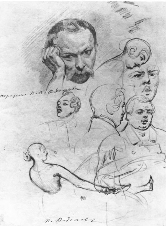 Наброски, сделанные П. А. Федотовым в больнице Всех Скорбящих. 1852 г. В центре — император Николай I, разглядывающий лицо художника сквозь лупу