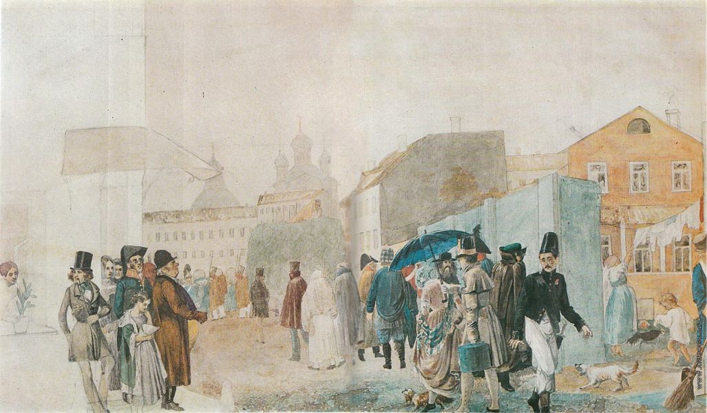 Уличная сцена в Москве во время дождя. Бумага, акварель. 1837 г.