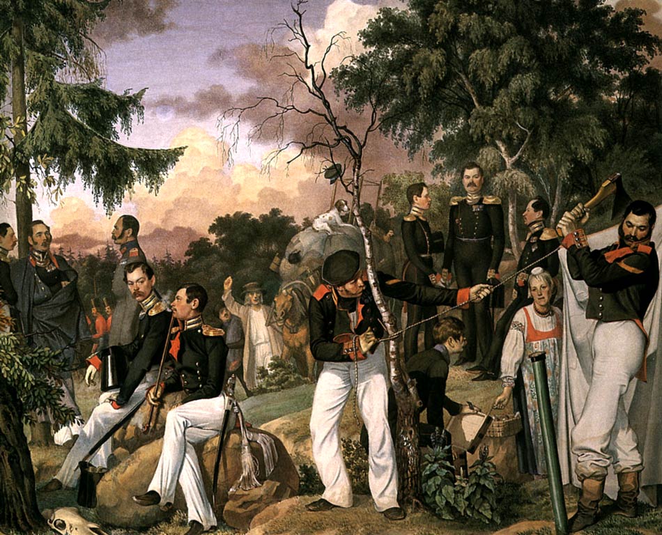 Приход дворцового гренадера в свою бывшую роту Финляндского полка. Эскиз. Картон, масло. Конец 1840-х гг.