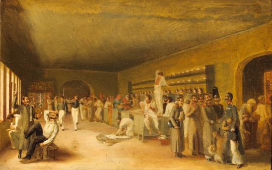 Магазин. П. Федотов. Бумага на картоне, сепия, кисть, перо. 1844 г.