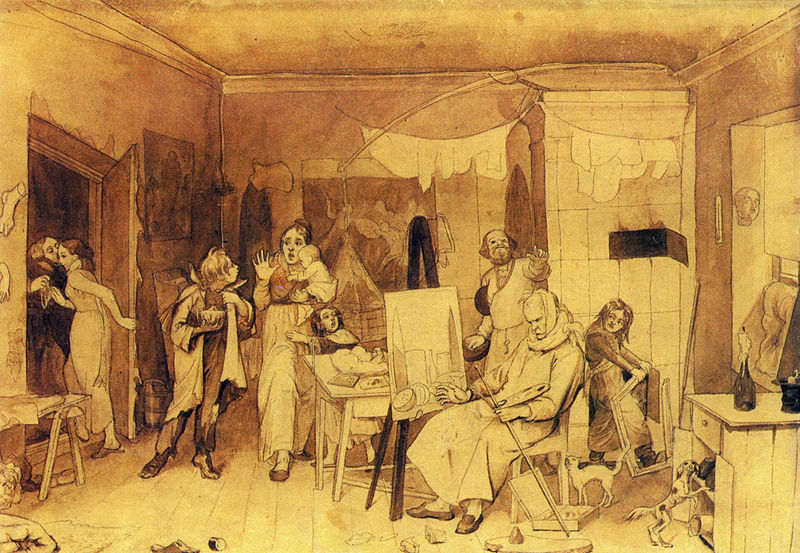 Художник, женившийся без приданого в надежде на свой талант. П. Федотов. Бумага на картоне, сепия, кисть, перо. 1844 г.