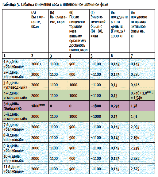 Таким образом, за месяц активной фазы при интенсивной схеме питания вы сбросите почти 5,3 кг (при условии, что ваш организм сжигает 2000 ккал в сутки).