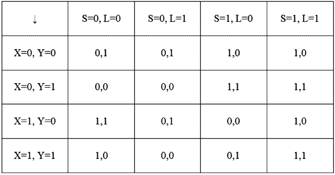 Если переменные суть S = Пение, L = Смех, X = игра на органе, Y = сжигание ладана – и если каждая переменная принимает значения 0 и 1, обозначающие соответственно бездействие или действие, то легко найти машину с входом (смотри табл. 6)