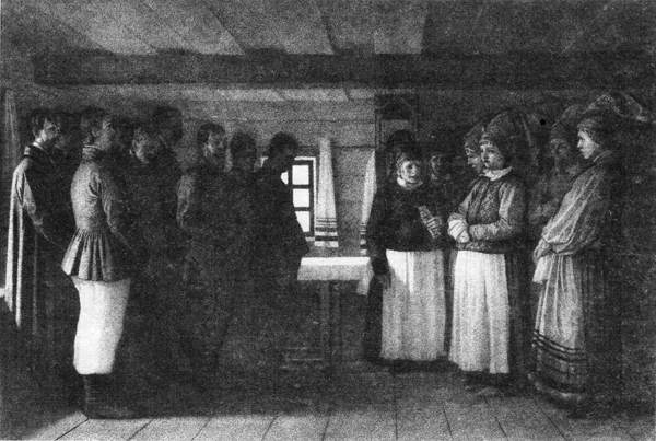 Художник побывал на молениях молокан. Пресвитер, толстый пожилой мужчина с обрюзгшей физиономией, сидел на почетном месте. Рядом с пресвитером — его помощники, верхушка сектантской общины. На скамьях, вокруг стола рассаживался народ попочтеннее, за ним — молодые парни, а женщины — позади. Женщину молокане считали чином пониже, чем мужчину. Пресвитер читал что-либо из Священного писания, давая свои, иногда нелепые и путаные толкования. После чтения начинались молитвенные песнопения.