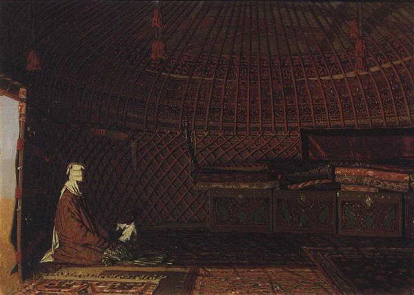 В небольшой картине «Богатый киргизский охотник с соколом» (1871) угадывается восхищение художника колоритным народным образом. В ней показана красочно-бытовая, праздничная сторона среднеазиатской жизни. Пожилой киргиз с красивыми чертами загорелого лица, в ярком праздничном костюме и светлой войлочной шляпе держит на поднятой правой руке охотничьего сокола и любуется птицей. Сокол, расправивший крылья, готов повиноваться условному сигналу хозяина и взлететь за добычей. Высвеченная фигура охотника выписана на фоне внутреннего убранства юрты. Богатый узорчатый костюм охотника, ковровый орнамент подчеркивают художественный вкус киргизского народа.