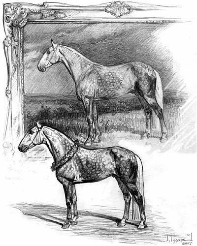 Живописцы увековечивают таких лошадей на полотнах, как, например, сам Серов написал Летучего, академик Самокиш сделал портрет его сына – Громадного, а Савицкий запечатлел схватку Улова, правнука Громадного, с Талантливым и Пилотом. Профессор коневодства В. О. Витт говорил о серовском портрете Летучего: «Подходя к картине, вы сразу замечаете ярко выраженную индивидуальность жеребца. Создается впечатление, что Летучий хочет ударить, отбросить непрошеного посетителя, осмелившегося чересчур близко подойти к нему. Недоверчиво строгим взглядом смотрит жеребец, и становится ясным, что его огневой темперамент лишь с трудом поддается обузданию со стороны человека, с не меньшим трудом, чем поддается он запечатлению на полотне художника». На этом портрете выдающегося рысака мы видим ту богатую кость, ту породность, что сказываются в потомстве этой линии до сих пор.