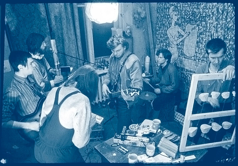 Репетиция группы «Среднерусская возвышенность» в квартире Никиты Алексеева. 1987, Слева направо: Николай Овчинников, Свен Гундлах, Авдотья Смирнова, Сергей Воронцов, Сергей Волков и Никита Алексеев.