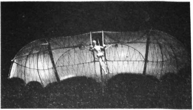 Понял ли это Леонардо или нет, но, когда через пятнадцать лет он, находясь во Фьезоле, снова взялся за изучение полета, он думал уже о полете с помощью ветра, т. е. о парящем полете, справедливо заметив, что в этом случае требуется меньше усилий для удержания и продвижения в воздухе. Он разработал конструкцию планера, прикреплявшегося к спине человека так, чтобы последний мог балансировать в полете. Основная, самая широкая, часть крыльев была неподвижна, однако их окончания могли изгибаться при помощи тросов и изменять направление полета.