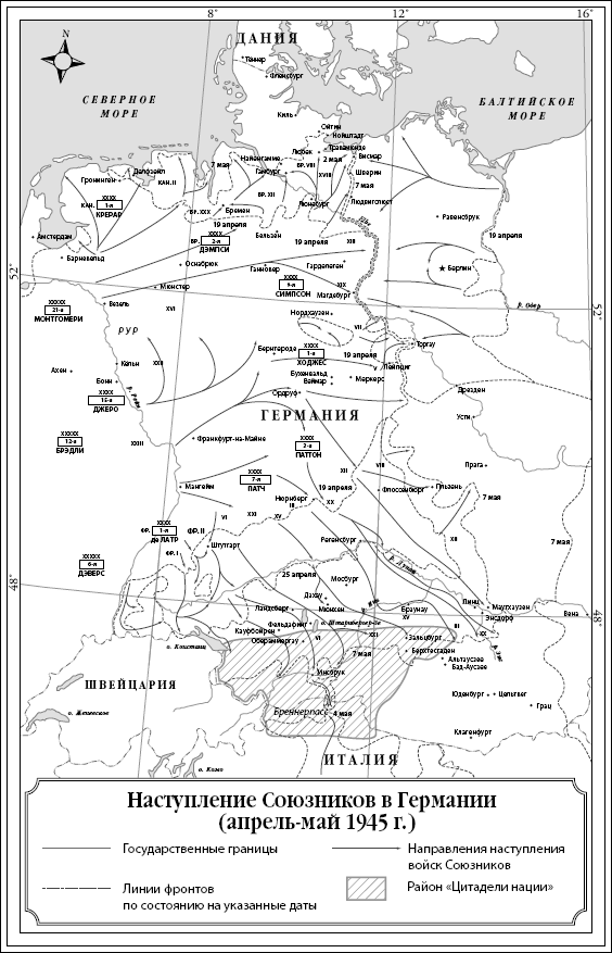 После многих дней раздумий Эйзенхауэр пересмотрел свою стратегию европейской кампании. 28 марта 1945 г. после полудня он изложил свои намерения в трех телеграммах. [301] Одна из них была адресована лично Сталину – это был единственный случай за время войны, когда генерал обратился к советскому лидеру напрямую. Вторая ушла генералу Маршаллу в Вашингтон, а третья – фельдмаршалу Монтгомери, командующему британо-канадской 21-й группой армий на севере Германии. Вопреки яростным протестам некоторых генералов, в частности Паттона и Монтгомери, которые желали возглавить наступление на Берлин, Эйзенхауэр объявил, что основной удар его войск будет направлен на юг – на Баварию, Австрию и в предполагаемый район расположения «Цитадели нации». Берлин был оставлен Красной Армии. Эйзенхауэр гнался за ценными военными трофеями, а не за пустой славой.