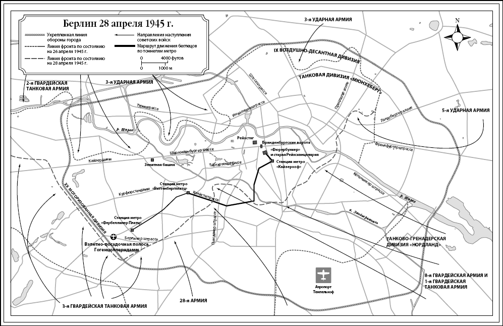 Группа вошла в систему тоннелей берлинского метро в районе станции «Кайзерхоф» (ныне станция метро «Моренштрассе»). Стены были покрыты зеленой люминесцентной краской на основе фосфора, и отраженный от них свет переносных фонарей окутывал беглецов призрачным заревом. В тоннеле было сыро и местами – пока они проходили узловую станцию «Виттенбергплац» и направлялись в сторону «Фербеллинер Плац» – приходилось идти по щиколотку в воде. Изнурительный семикилометровый переход занял три часа, и подгонял их не только шум канонады наверху, но и отдаленное эхо выстрелов из мелкокалиберного оружия – где-то в тоннелях метро уже сражались советские и немецкие солдаты.