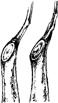 Кербовка. Если у молодого растения необходимо усилить рост ветки или спровоцировать прорастание определенной почки, над ними делают серповидный надрез. Для этого на расстоянии около 0,5 см над веткой или почкой острым ножом вырезают полоску коры шириной примерно 3 мм с небольшим слоем древесины. Чтобы, наоборот, ослабить ветку или почку, такой надрез делают на том же расстоянии снизу.