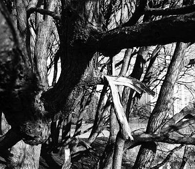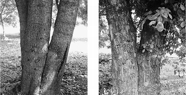 Ветви, отходящие под острым углом. Это одно из самых распространенных явлений, на которое, тем не менее, мало кто обращает внимание. Пока ничего не случилось, такие ветви не причиняют никакого беспокойства. Однако это своеобразная «бомба замедленного действия». Рано или поздно она «срабатывает», и дерево в этом месте разламывается, зачастую до самого основания. Причина становится очевидной, если рассмотреть продольный разрез ствола в этой зоне. Эти ветки имеют непрочное крепление со стволом, так как слои древесины разделены слоем отмершей коры.