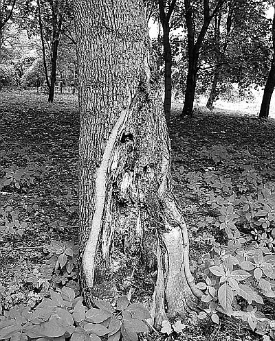 Разлом ствола взрослого дерева из-за острого угла расхождения
