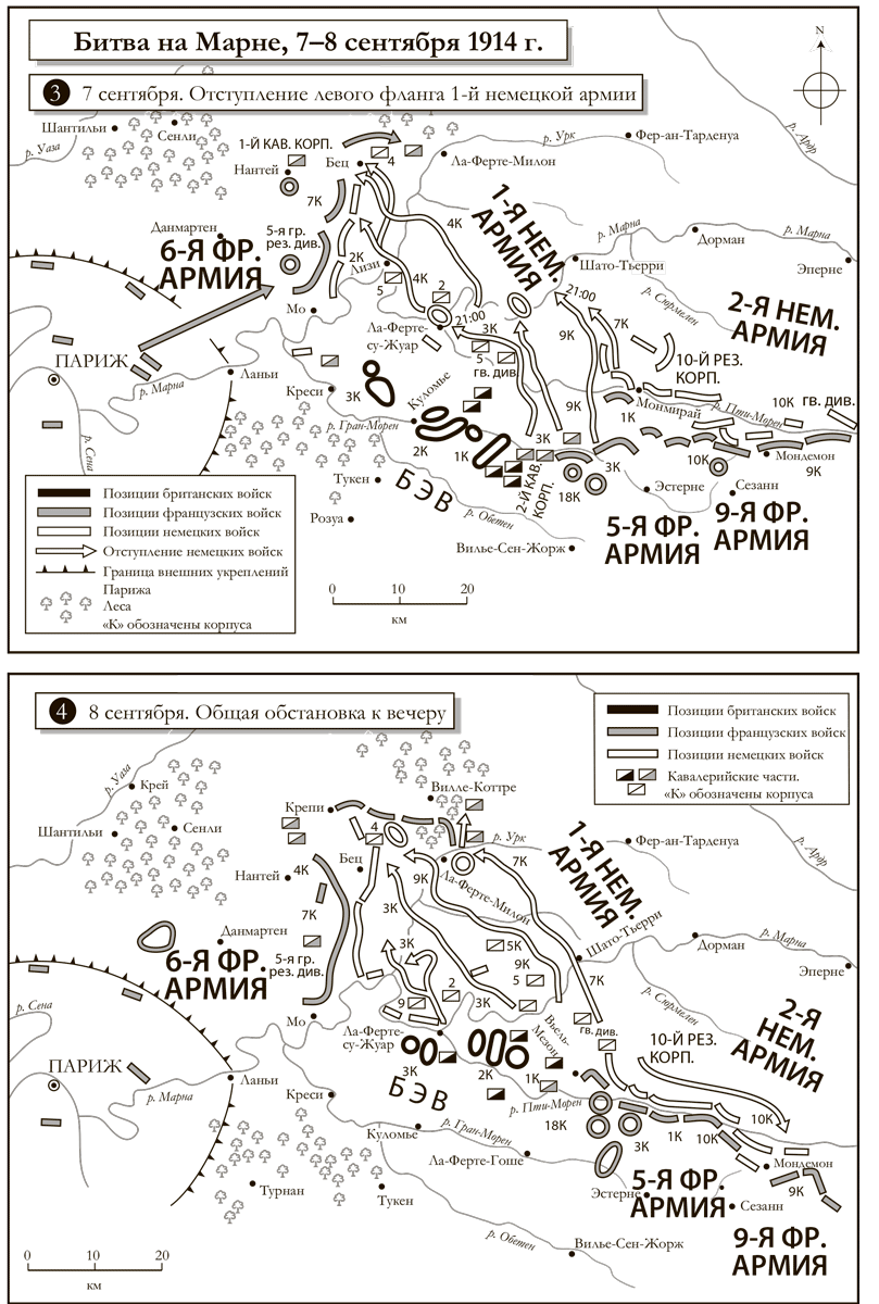 Александр Джонстон, бригадный офицер связи из 2-го корпуса, писал в замешательстве: «Выступили только в 5 вечера. Не понимаю. Ведь Устав полевой службы велит “не жалеть ни людей, ни лошадей, ни орудий во время преследования врага”. <…> Говорят, если бы наш 1-й корпус чуть поднажал, мы еще прошлым вечером загнали бы немцев в угол». Арьергард кавалерии Марвица предпринял череду «беспокоящих действий», которые благополучно притормозили британцев, замедлив их скорость до улиточной. Вполне справедливо утверждать, что (в полном соответствии с пожеланиями своего главнокомандующего) во время решающих сражений на Марне британцы присутствовали телом, но не духом. Донесения о том, что солдаты обессилены, поступали в тыл потоком от всех армий, однако неспешность британцев поражает еще больше по сравнению со стремительностью, проявленной при смене фронта Клюком: его войска промаршировали почти 65 км 7 сентября, и около 70 км – 8-го.