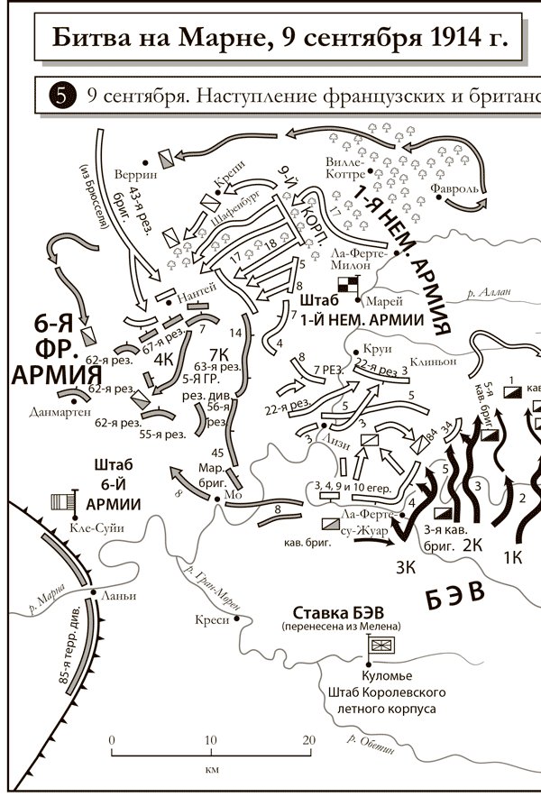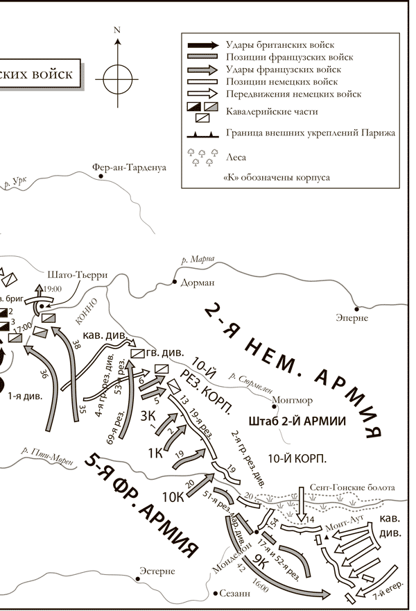 Тогда же, утром 9 сентября, подполковник Хентш нанес еще один важный визит. До штаба Клюка он доехал по кошмарным запруженным дорогам лишь в половине двенадцатого утра, да еще в какой-то момент его автомобиль обстреляли солдаты ландвера. Повсюду его встречали тревожными вестями, что французы перебрались через Марну и наступают на пятки. Но Клюк и его штаб были полны уверенности (вполне правомерной), что им удалось остановить Манури. Теперь, по словам начальника штаба армии, они готовились разгромить французов окончательно. Левый фланг Манури разваливается, его войска деморализованы и несут большие потери. И тут внезапно возникает эмиссар Мольтке, объявляющий, что Бюлов разбит и отступает, а значит, Клюк должен отступить тоже, иначе он подставит тылы британским экспедиционным войскам. Для пущей убедительности Хентш рассказал, как пробирался через толчею отставших и беженцев, санитарных и интендантских обозов.