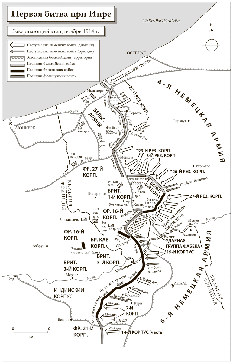 Как ни ужасал британцев урон, нанесенный экспедиционным войскам, потери французов превысили его в 10 раз. Если говорить о командирах, то заслуга удержания фронта под Ипром принадлежит (кроме Хейга) именно Фошу с его энергией, интуицией и вдохновляющим руководством. Боевой состав бельгийской армии уменьшился наполовину. За эти страшные недели с 18 октября по 12 ноября погибли не только десятки тысяч людей, но и множество надежд. Генералы, впрочем, не отчаивались: добиваться победы было не только их правом, но и долгом. Однако солдаты, сражающиеся друг против друга в окопах, не только у Ипра, но на сотнях километрах фронта, протянувшегося через равнины, долы и холма до швейцарской границы, видели правду. Обе стороны обладали безграничными возможностями навлекать друг на друга страдания и смерть, однако, пока и у той, и у другой хватало людей и оружия, оборона получала подкрепление быстрее, чем атакующим удавалось воспользоваться прорывом на конкретном участке.