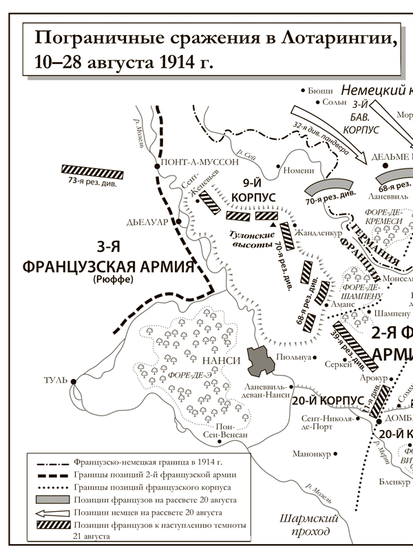 19 августа французы снова заняли Мюлуз, изрядно потрепав противника. Сами они тоже понесли существенные потери, и на этот раз население встречало их с опаской. Те, кто ликовал в первый раз, были жестоко наказаны вернувшимися немцами, поэтому теперь эльзасцы боялись повторения. Генерал Поль-Мари По, удовлетворившись взятием города, наступать дальше на восток отказался. 14 августа 2-я армия генерала Эдуарда де Кастельно чуть севернее вошла в западную Лотарингию (открытую сельскую местность с вкраплениями угольных и соляных копей) в излюбленной французами манере – с маршами, полковыми знаменами и красавцами-офицерами на боевых конях. Немцы не особенно препятствовали проходу, поскольку подготовили горячий прием в 30 км к востоку. В Эльзасе и Лотарингии было хорошо налажено стратегическое железнодорожное сообщение, от станций отходили дополнительные ветки, специально проведенные для выгрузки войск, – как, например, в приграничном лотарингском селении Шамбре, где здание станции стилем (да и размерами) напоминало небольшой замок. Немцы намеревались заманить французов в ловушку, позволив им продвигаться до тех пор, пока они не попадут под удар с трех сторон.