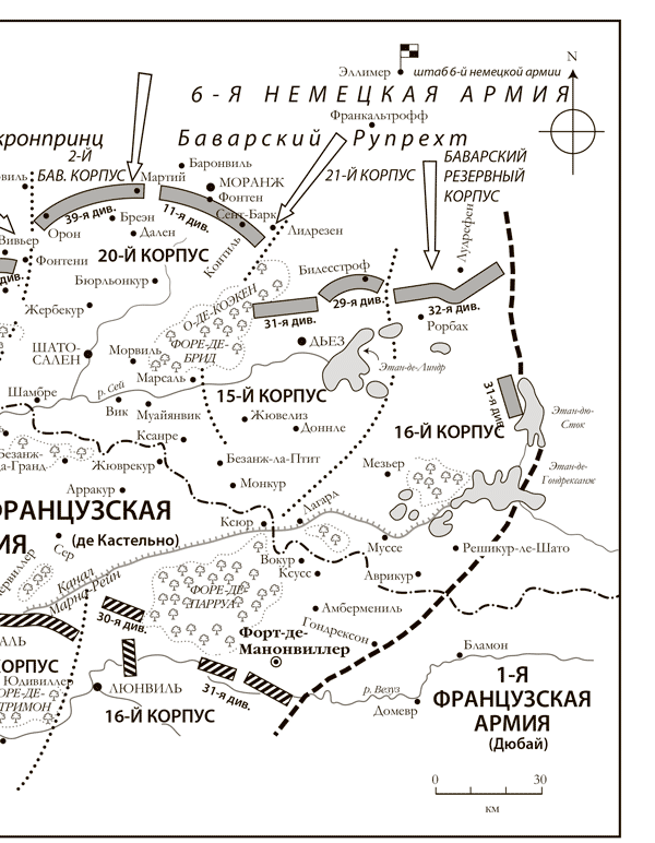 На стороне противника, в Лотарингии, стояла 6-я немецкая армия под командованием 45-летнего кронпринца Рупрехта Баварского, который контролировал также 7-ю армию по левому флангу, в южном Эльзасе. В те дни в немецких войсках (в последний раз в истории) еще соблюдался региональный состав, и армию Рупрехта Баварского действительно в основном составляли баварцы. Мольтке дал ему указание удерживать стратегическую оборону – то есть оттянуть на себя как можно больше французских сил, пока остальные будут обходить их с севера. Таким образом, обе немецкие армии теперь ждали хода Жоффра.