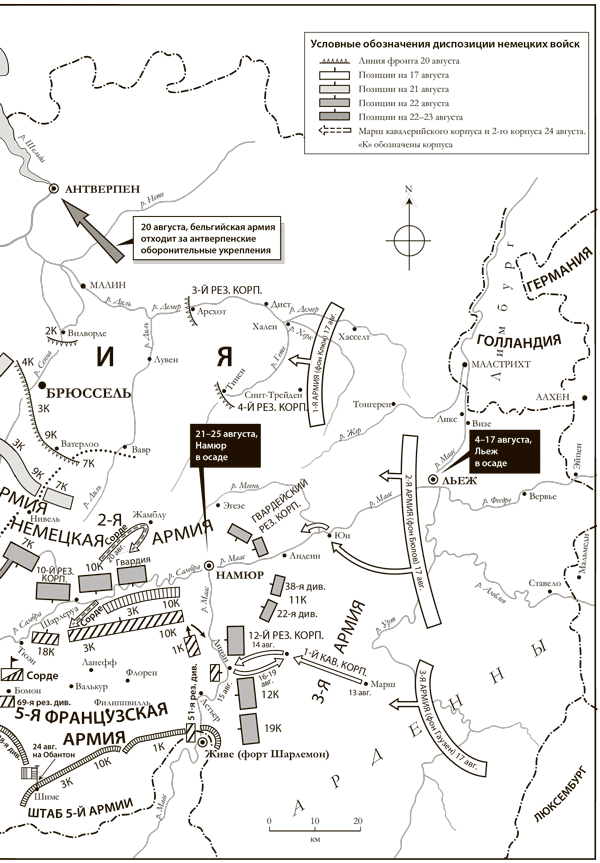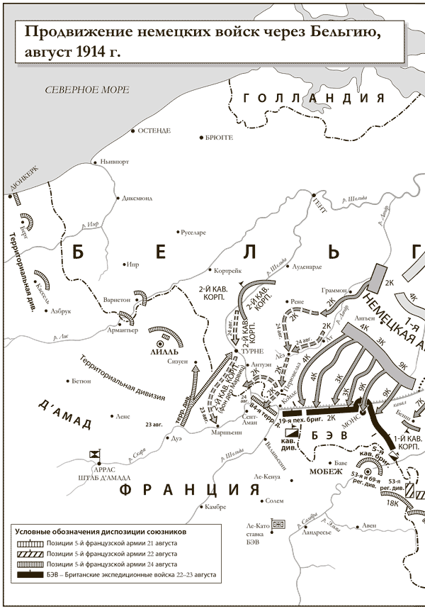 Пока французские войска наступали на немцев на всем протяжении восточной границы Франции, правый фланг армии Мольтке маршировал к центру театра военных действий, обеспечивая себе главенство на ближайшее время. Судьба Европы будет решаться именно в Бельгии и на севере Франции, а не в Люксембурге, Эльзасе и Лотарингии. Почти 600 000 немецких солдат в составе двух армий, пройдя Брюссель, направились на юг, к границе между Бельгией и Францией. На их пути стояла 5-я французская армия, которая вместе с британскими экспедиционными войсками в качестве подкрепления могла сравниться по численности лишь с половиной сил противника.