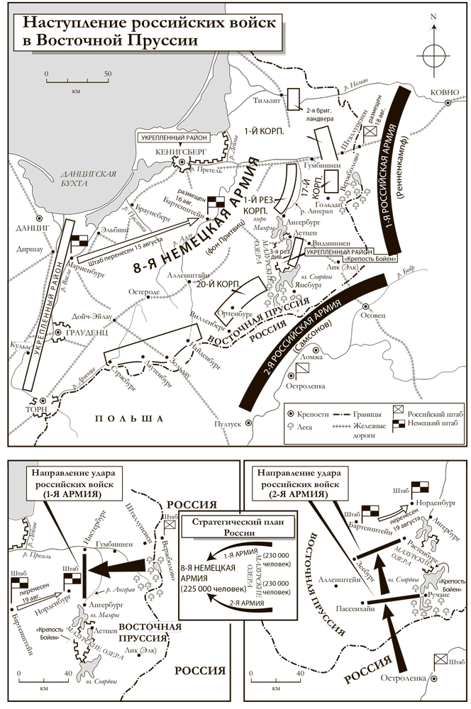 В центре Восточной Пруссии располагалось ожерелье Мазурских озер, окруженных болотистыми землями. 1-я российская армия под командованием генерала Павла Ренненкампфа двинулась на запад от северной границы озер; 2-я армия Александра Самсонова с отрывом в несколько дней выступила от их южной границы. Таким образом, командующих разделяли пространство, время и некоторая взаимная неприязнь, возможно, несколько преувеличенная. Вторгшиеся в Пруссию войска расклеивали повсюду высокопарное обращение: «Мы, представители России, несем вам, пруссам, единое славянство». Самсонов проявил безрассудную самонадеянность, отправив свой радиопередатчик обратно в Польшу, а затем выехав на рекогносцировку без средств срочной связи. Большинство телефонных линий к тому времени было обрезано.