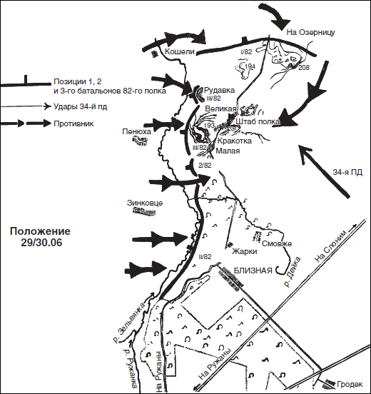 30 июня условия обороны 82-го полка на случай дальнейших русских атак значительно улучшились. Сосед справа (34-я пехотная дивизия) ликвидировал брешь у деревни Кошели и тем самым развязал руки нашему северному флангу (1-й батальон) и позволил перевести его в стык между 3-м и 2-м батальоном. Кроме того, мы получили подкрепление – 2-й батальон 17-го пехотного полка (командир майор Корфес) и 1-ю батарею 845-го артиллерийского полка. Была также устранена нехватка боеприпасов. Летчики сообщали о движении с запада новых крупных русских сил в направлении Зельвянки, но 30 июня имели место лишь спорадические атаки русских, которые были сравнительно легко отражены. Задача 82-го пехотного полка была выполнена, когда на западном берегу Зельвянки 1 июля, перед фронтом 82-го полка, появился наступавший на север 12-й пехотный полк.