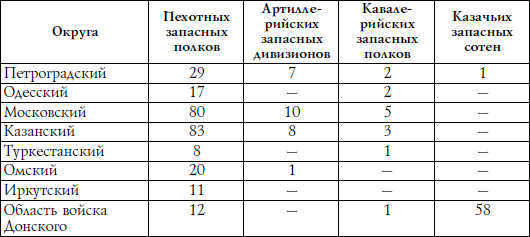 Однако в большинстве округов складывалась ситуация, когда списочный состав запасных батальонов многократно превышал штаты, на обучение людей не хватало ни офицеров, ни оружия. «Праздная толпа, тесно размещенная в казармах и не видевшая оправдания своему призыву, естественно, представляла из себя крайне благоприятную среду для противоправительственной и пораженческой пропаганды» [759] .