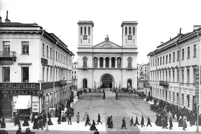 Обширный участок по проспекту между Большой и Малой Конюшенными улицами в течение двух веков являлся главным центром немецкой колонии Петербурга. Единое огромное владение было отведено немецкой евангелическо-лютеранской общине по указу Петра II в декабре 1727 года. Ее основателем считается флотоводец К.И. Крюйс: лютеранско-реформатская церковь, открытая в 1708 году на его подворье у Невы, стала родоначальницей протестантских храмов Петербурга, и прежде всего – немецкого. Первая из иноверческих церквей на Невском проспекте была возведена в 1728–1730 годах под руководством военного инженера графа Б.Х. Миниха при участии первого архитектора Петербурга Д. Трезини, отделку завершил И.Я. Шумахер. Бытовало и другое название Немецкой лютеранской церкви – Петропавловская. Здание было решено по типу базилики. Фасады обработаны пилястрами и фигурными наличниками окон. Над высокой кровлей с переломом поднималась башня, завершенная восьмигранным ярусом и куполом с фонариком. Она стала первой высотной доминантой северной стороны Невского. Церковь была поставлена в глубине участка, а со стороны проспекта ее фланкировали угловые дома. В начале XIX века органистом в церкви служил Г.Н. Гербер, ученик И.-С. Баха.