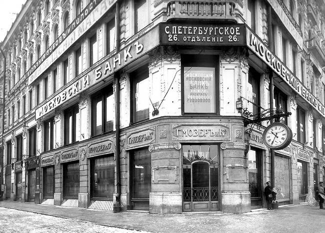 Русский для внешней торговли банк, основанный в 1871 году, находился в доме до 1888 года. Среди его учредителей были банкирские дома Э.М. Мейера, И.Е. Гинцбурга, братьев Елисеевых. Частично сохранилась отделка интерьеров и элементы банковского оборудования (в том числе изготовленные заводом Ф.К. Сан-Галли). В 1882–1891 годах в здании работала первая в России телефонная станция, оборудованная американской компанией «Белл». Она имела семь магистральных линий, расходившихся в разные части города. Ажурная башня станции была устроена Кенелем, к тому времени осуществившим строительство цирка Г. Чинизелли. Впоследствии дом принадлежал наследникам Гансена. В числе располагавшихся в нем магазинов – часовой «Г. Мозер и К°», ювелирный К. Гана, ас 1911 года – ювелирной фирмы «А. Тилландер и К°», основанной в 1860 году. Рядом размещались Финляндский мебельный салон, табачный магазин фабрики «Лаферм», зубная лечебница и зубоврачебная школа Е.С. Вонгл, контора акционерного общества «Объединенное шведское электричество». Тут же находились представительства коммерческих учреждений: Азовско-Донского, Московского и Финляндского банков, банкирского дома братьев Рябушинских. В 1912 году по проекту архитектора К.К. Шмидта выполнена новая отделка фасадов двух нижних этажей.
