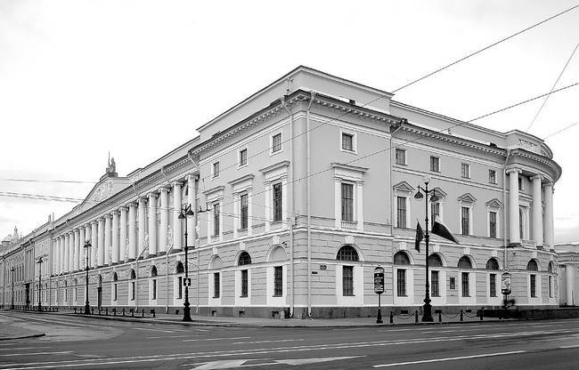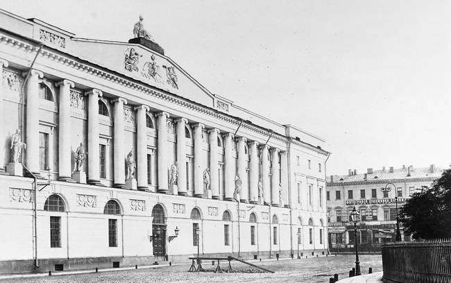 Основанная в 1795 году, Публичная библиотека открылась после размещения книжного собрания в январе 1814 года. В 1828–1834 годах она была расширена новым корпусом с двумя большими читальными залами. Он возводился по проекту К.И. Росси, строительными работами руководил архитектор А.Ф. Щедрин. Этот корпус присоединен со стороны площади (ныне площадь Островского, № 1) к узкому, в три оси, торцу первого здания. Росси повторил членения и некоторые формы сооружения Соколова, добившись единства обеих частей библиотеки, но сделав свой новый фасад более важным и репрезентативным. Протяженная ионическая колоннада из 18 колонн охватывает основную часть фасада между боковыми ризалитами. Скульпторами В.И. Демут-Малиновским, С.С. Пименовым, С.И. Гальбергом, Н.А. Токаревым и М.Г. Крыловым изваяны статуи античных ученых, философов и поэтов, а также фигура богини мудрости Минервы над трапециевидным аттиком (воссоздана в 1966 году).