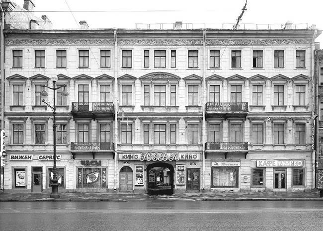 По этому адресу в начале XX века находился «Невский гараж» моторных лодок. В 1913–1914 годах во дворе сооружено двухъярусное здание кинематографа по проекту архитектора B.C. Карповича. Сейчас двухзальный кинотеатр «Нева» вновь открылся после реконструкции и реставрации.