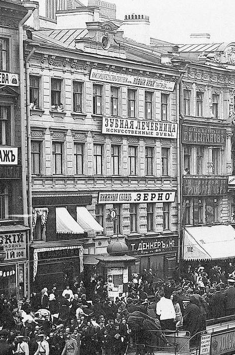 Построенный в начале XIX века четырехэтажный дом принадлежал купцам Змеевым. При В.Ф. Змееве, в 1879 году, он был перестроен архитектором И.И. Григорьевым. Обычный эклектический фасад завершен столь распространенным в застройке той поры сложнофигурным фронтоном с круглым отверстием. Затем участком владел потомственный почетный гражданин А.В. Змеев. В начале XX века здесь размещались книжный склад издательства «Зерно», Петербургское отделение книгоиздательства «Новый край», зубная лечебница и магазин фирмы «Т. Денкер и К°».