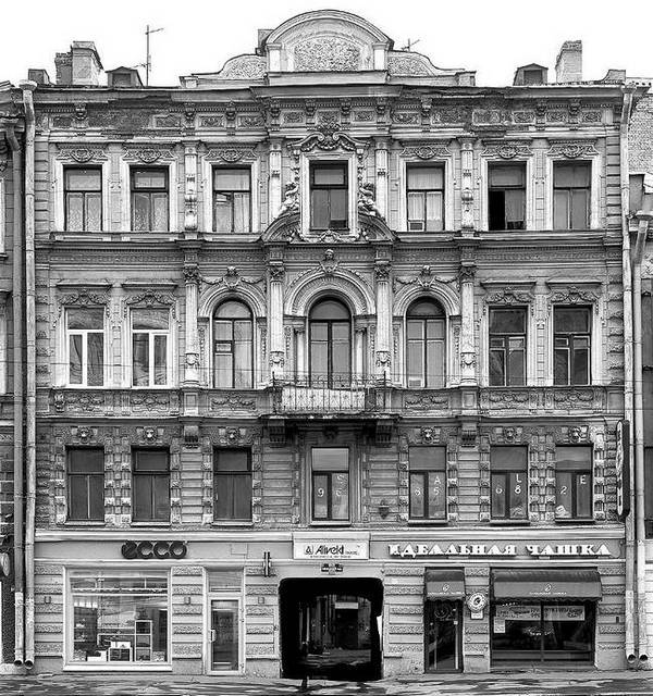 Фасад дома, сооруженного на участке в начале XIX века в формах строгого классицизма, имел характерную для ранней застройки этого квартала аркаду и выделялся введением портика. Однако уже в 1828 году архитектор П.С. Пыльнев перестроил здание и упростил оформление фасада. В отличие от соседей, этот трехэтажный дом в дальнейшем избежал больших переделок и сохранял черты позднего классицизма. Строгий безордерный фасад со скупыми деталями – сандриками над окнами второго этажа и лепным фризом – оставался единственным в квартале напоминанием о былой застройке прилегающего отрезка проспекта в первой трети XIX века.