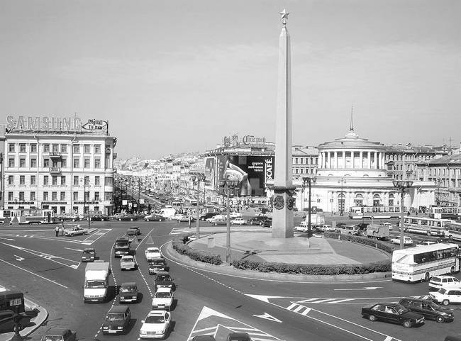 Еще в 1957 году в центре площади поставили закладной камень памятника В.И. Ленину. К 40-летию Победы на том же месте, в фокусе Невского проспекта, был воздвигнут обелиск городу-герою Ленинграду, авторы проекта B.C. Лукьянов, А.И. Алымов, Б.Н. Брудно, В.М. Иванов. Высокий тонкий гранитный обелиск, напоминающий штык, имеет в сечении форму пятиконечной звезды. На постаменте установлены горельефы с изображением защитников блокадного города (скульпторы А.А. Виноградов, Б.А. Петров, В.Д. Свешников, А.С. Чаркин). 34-метровый монумент увенчан Золотой Звездой. Памятник стал идейно-художественным акцентом площади, хотя не получил широкого признания горожан. Не раз поднимался вопрос о его переносе.
