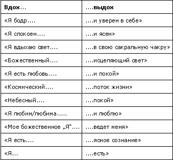 Ниже приводится несколько идей, которые могут послужить образцами для личных дыхательных мантр. Их воздействие усиливается, когда с ними связывается какое-либо образное представление. Медитация с дыхательной мантрой – это очень сильный метод воздействия, ее нужно проводить по меньшей мере в течение десяти минут в состоянии глубокого расслабления или в повседневной жизни в виде автоматического повторения, которое протекает в уме. Дыхание при этом приятно глубокое и спокойное.