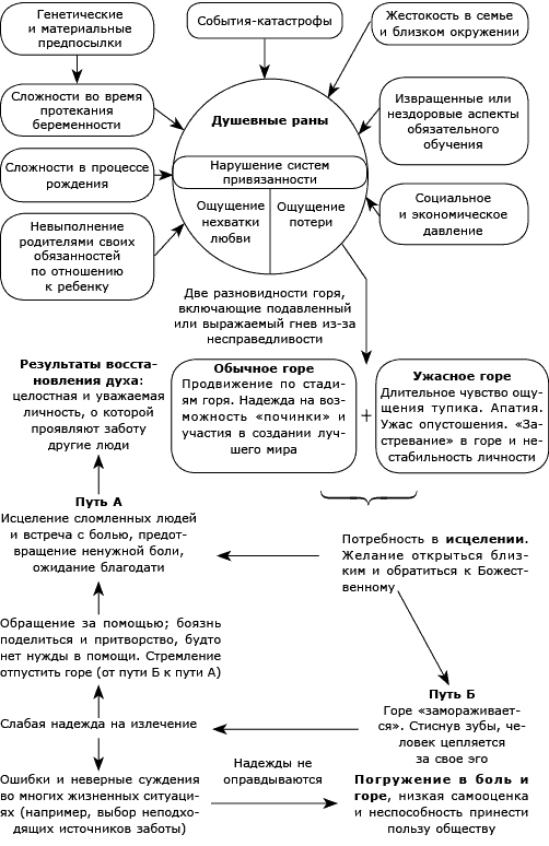 На рисунке 12 показаны два пути (путь А и путь Б). Именно так раны духа могут быть излечены или (в правом нижнем углу рисунка) продолжат множиться в цикле эмоционального отчуждения, который был изображен ранее на рисунке 10. Необходима благодать для того, чтобы исцелить горе и исправить его, зачастую прочно закрепившиеся, последствия.