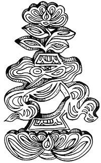 Обычно их перечень дается именно в такой последовательности360, хотя порою кое-какие предметы меняются местами. Тибетский список Л. А. Уоддела выглядит так: рыбы, зонт, раковина, узел, штандарт, ваза, лотос, колесо361. Восемь сокровищ китайского буддизма, по К. Уильямсу, идут друг за другом в следующем порядке: колесо Закона, раковина, зонт, флаг, лотос, сосуд, рыбы, мистический узел362. А монгольский список А. М. Позднеева таков: зонт, золотые рыбы, белая раковина, лотос, драгоценный сосуд, нить счастья, штандарт, тысячерадиусное колесо363.