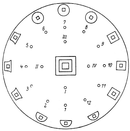 Цилиндр полый, дно отсутствует, но на верхнем круге разместилась скульптурная композиция. В центре ее возвышается четырехгранная ступа, нижняя половина которой как бы окутана стилизованным изображением горных отрогов. Вокруг этого центра тремя концентрическими кругами расположено несколько категорий священных буддийских символов (рис. 13). Первый круг образуют четыре предмета (I–IV), один из них утрачен, на его месте имеется отверстие, в которое вставлялся стержень с насажденным на него объектом. Остальные три: колесо с тысячью спиц (тысячерадиусное колесо закона), штандарт, зонт. Во второй круг входят 12 предметов (1–12). Перечислим их в том порядке, в каком они расположены, взяв за точку отсчета колесо и идя от него по часовой стрелке: