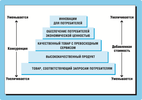 Обратим внимание, прежде всего, что на рисунке есть две оси. Левая символизирует остроту конкуренции и показывает, что, чем выше мы поднимаемся по ценностной лестнице, тем меньше нам надо опасаться конкурентов и тем крепче наши позиции на рынке. Правая ось символизирует уровень добавленной стоимости, которую компания получает от продаж, или, иными словами, доходность продаж. Как мы видим на рисунке, эта величина тоже увеличивается по мере подъема компании вверх по ценностной лестнице. За счет чего же это происходит?