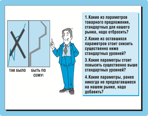 Первый вопрос звучит так: «Какие из параметров товара, стандартных для нашего рынка, надо отбросить вообще?» Чтобы на него ответить, надо попытаться понять: все ли характеристики вашего продукта, которые интересовали клиентов в прошлом, интересны им теперь и будут по-прежнему привлекать покупателя к товарам нашей фирмы. Если подойти к поиску ответа на этот вопрос без «трепета перед традициями», могут обнаружиться очень необычные решения, в корне меняющие саму логику бизнеса данной компании.