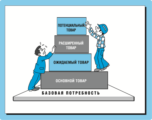 Первой ступенькой здесь является создание «основного товара», пригодного для удовлетворения базовой потребности покупателя. Таким основным товаром для фирмы по производству минеральных удобрений могут быть конкретные виды азотных, фосфорных или калийных удобрений. Они стандартны по основным характеристикам, и потому у компании, способной только на это, не будет на рынке удобрений особых преимуществ перед конкурентами. Соответственно, эти товары будут близки по модели продаж к биржевым товарам (commodities), по которым власть отдельной фирмы-изготовителя над ценой крайне мала и где постоянно возникают ценовые войны. Единственное, чему могут радоваться в этой ситуации топ-менеджеры такой фирмы, так это тому, что их продукция по крайней мере удовлетворяет стандартам данного рынка, и потому клиенты готовы рассматривать данную компанию как приемлемого поставщика. Но получит ли она заказ на поставку своей продукции или нет, зависит преимущественно от того, насколько низки ее цены по сравнению с ценами других конкурирующих производителей таких же удобрений.