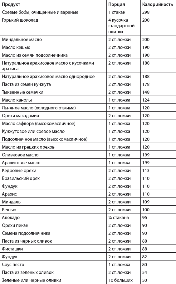 Продукты с этими жирами будут включены во все блюда и наборы закусок. Вы можете свободно менять один продукт на другой, если количество калорий в них примерно совпадает. Например, можно заменить миндальное масло (200 калорий) на четыре кусочка стандартной плитки горького шоколада (те же 200 калорий). Точное количество калорий в порциях продуктов с этими жирными кислотами приведено в таблице на с. 84–87. Вы можете распечатать эту таблицу и повесить ее в удобном для вас месте. Чтобы узнать больше о пяти группах продуктов с мононенасыщенными жирными кислотами, о том, как их выбирать, хранить и готовить, откройте страницу 84.