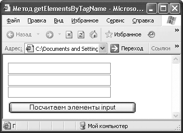 Данный сценарий содержит функцию getElements, которая производит подсчет всех элементов типа INPUT на веб-странице, а затем выводит результат в окне Alert (рис. 10.20).